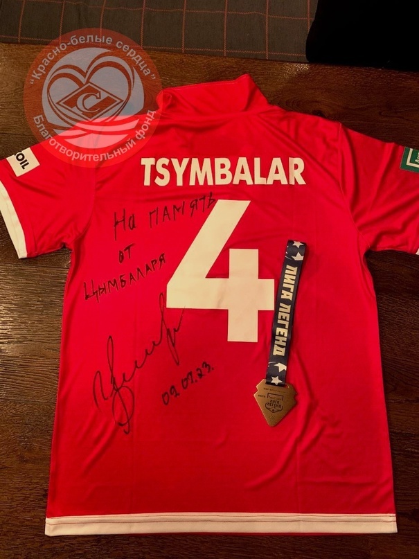 1-й лот - Игровая футболка Олега Цымбаляря с автографом и оригинальная медаль с матча-памяти Ильи Цымбаларя